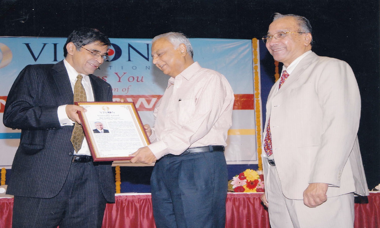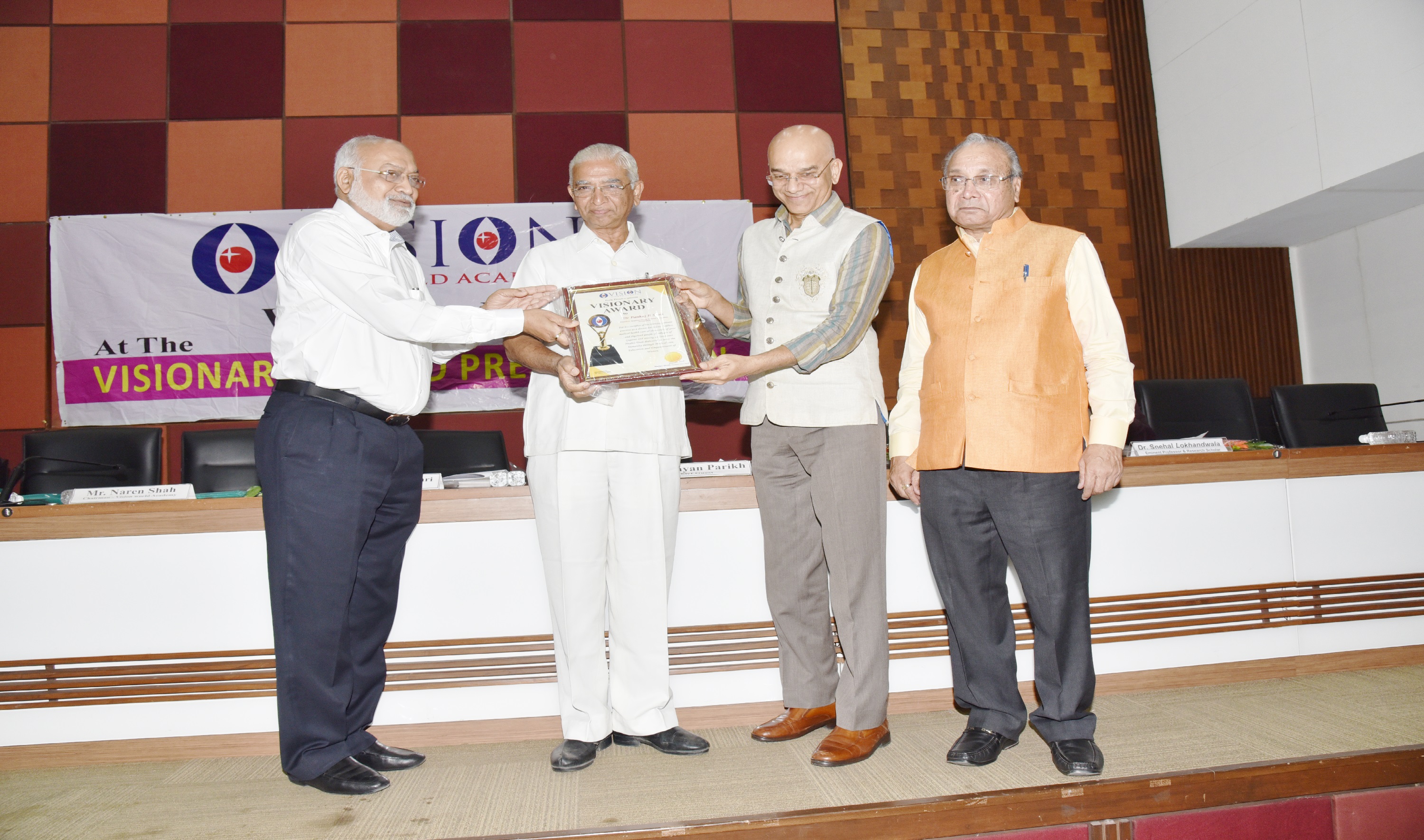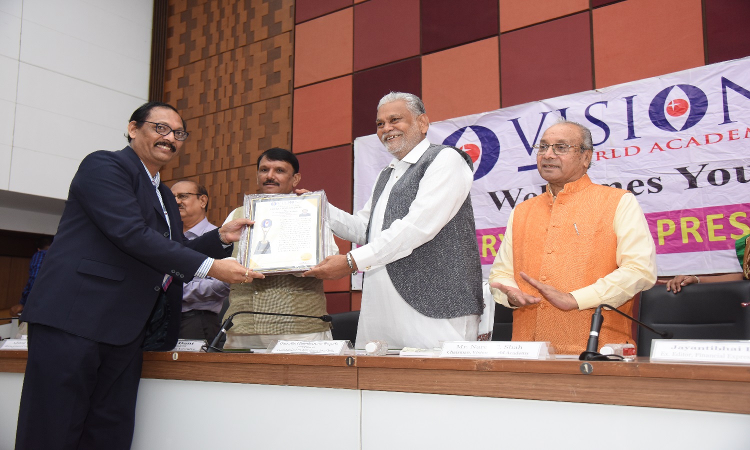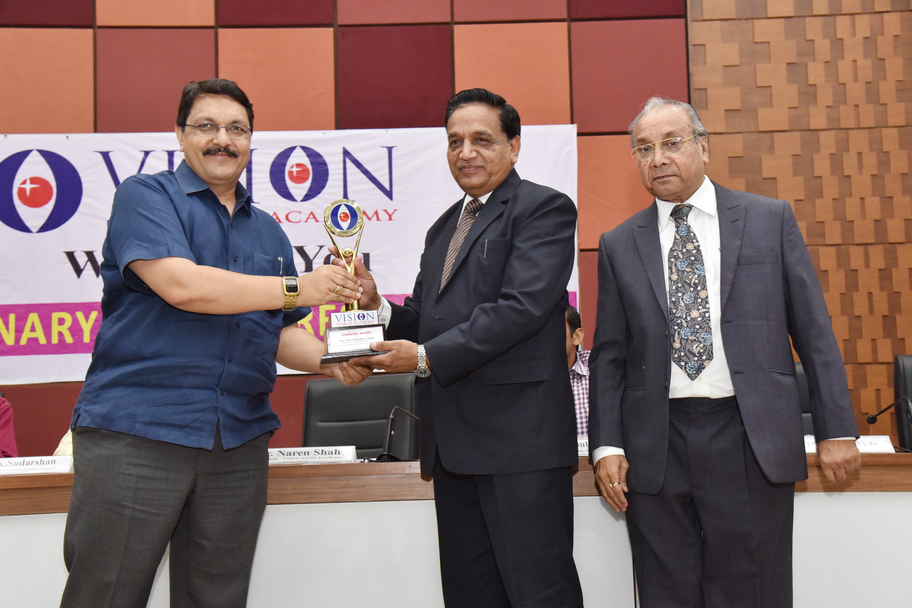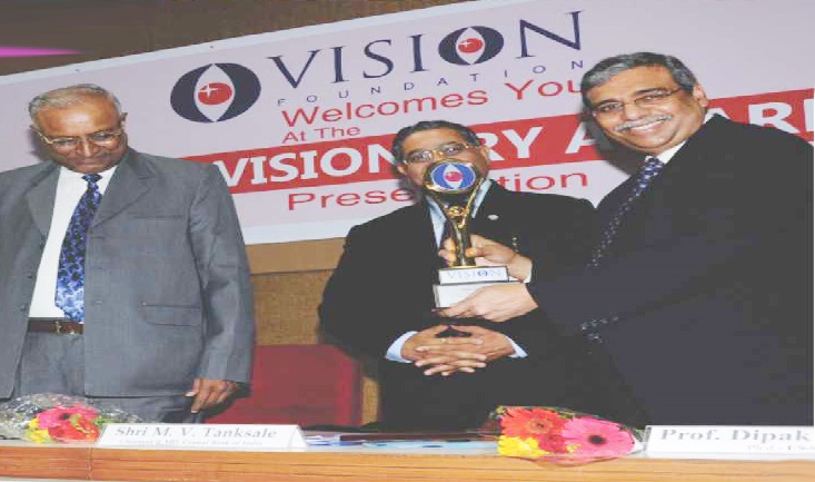 EX. Acting Chief Justice Gujarat B.J Sethna is presenting visionary Award to Shri M. Narendra CMD Indian Overseas Bank, Mr. Naren Shah Chairman of Vision world Academy on left.