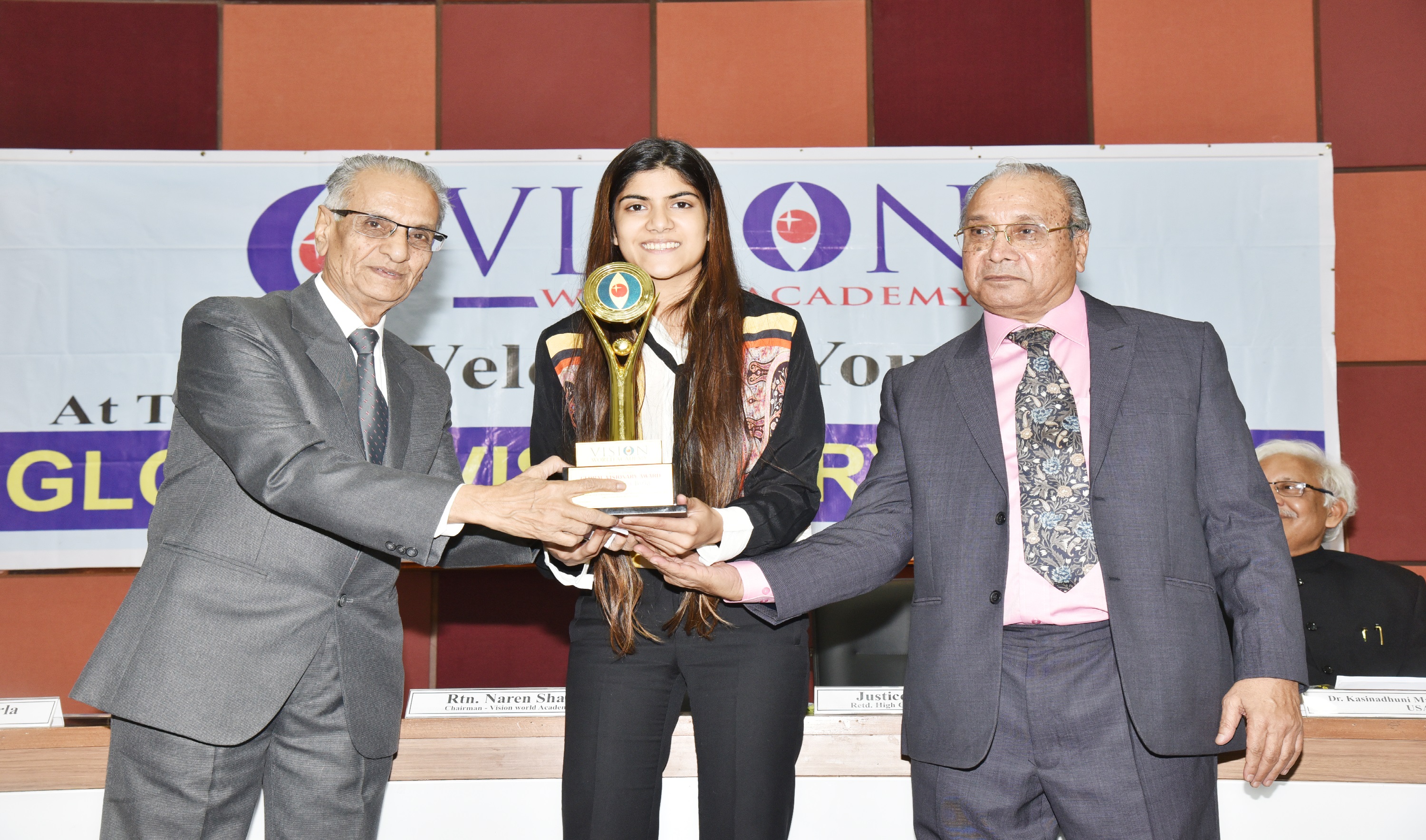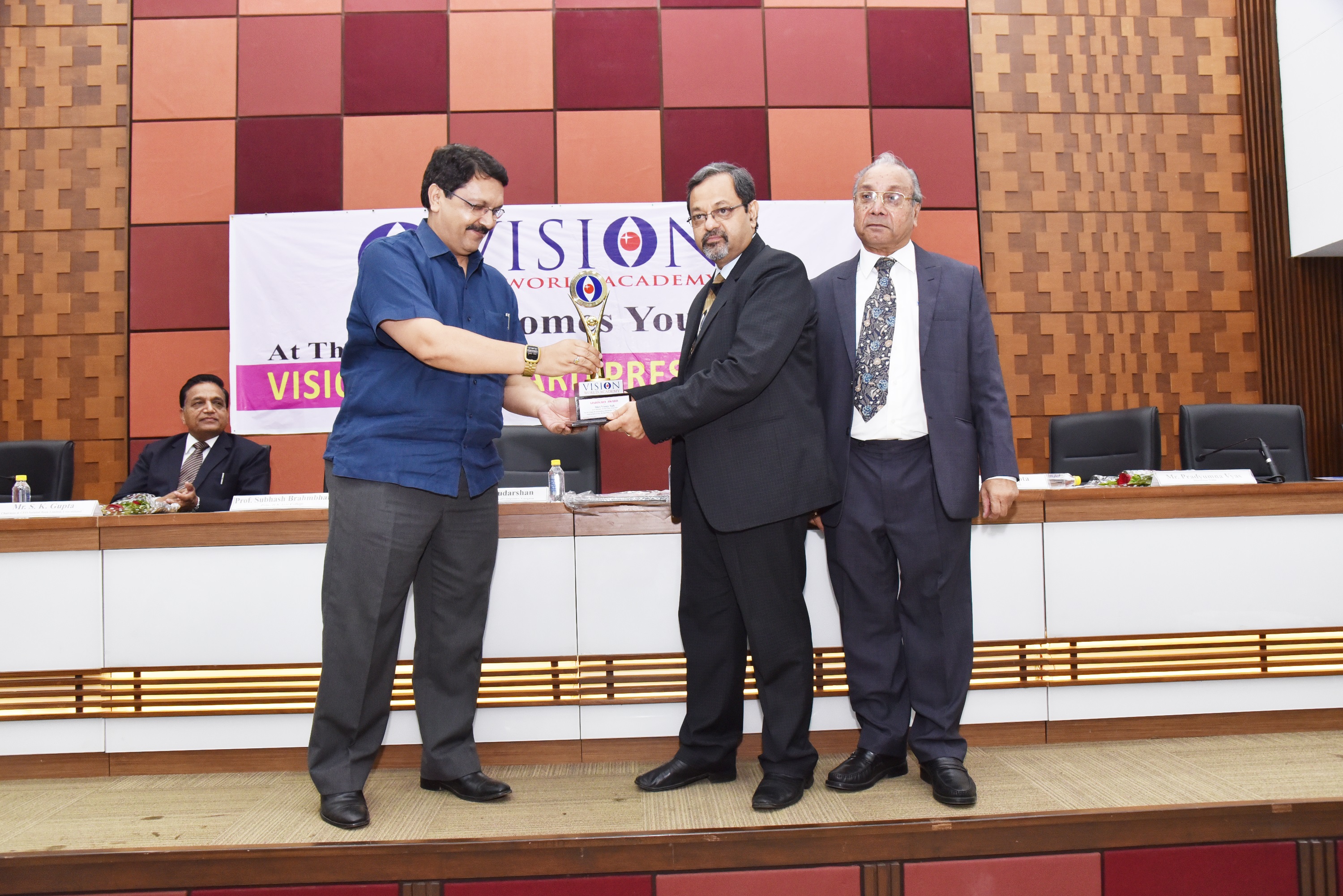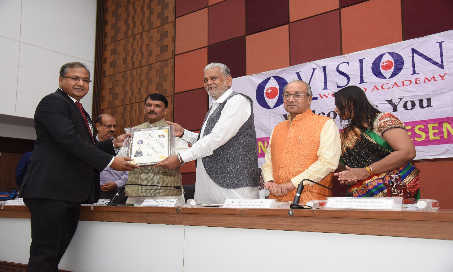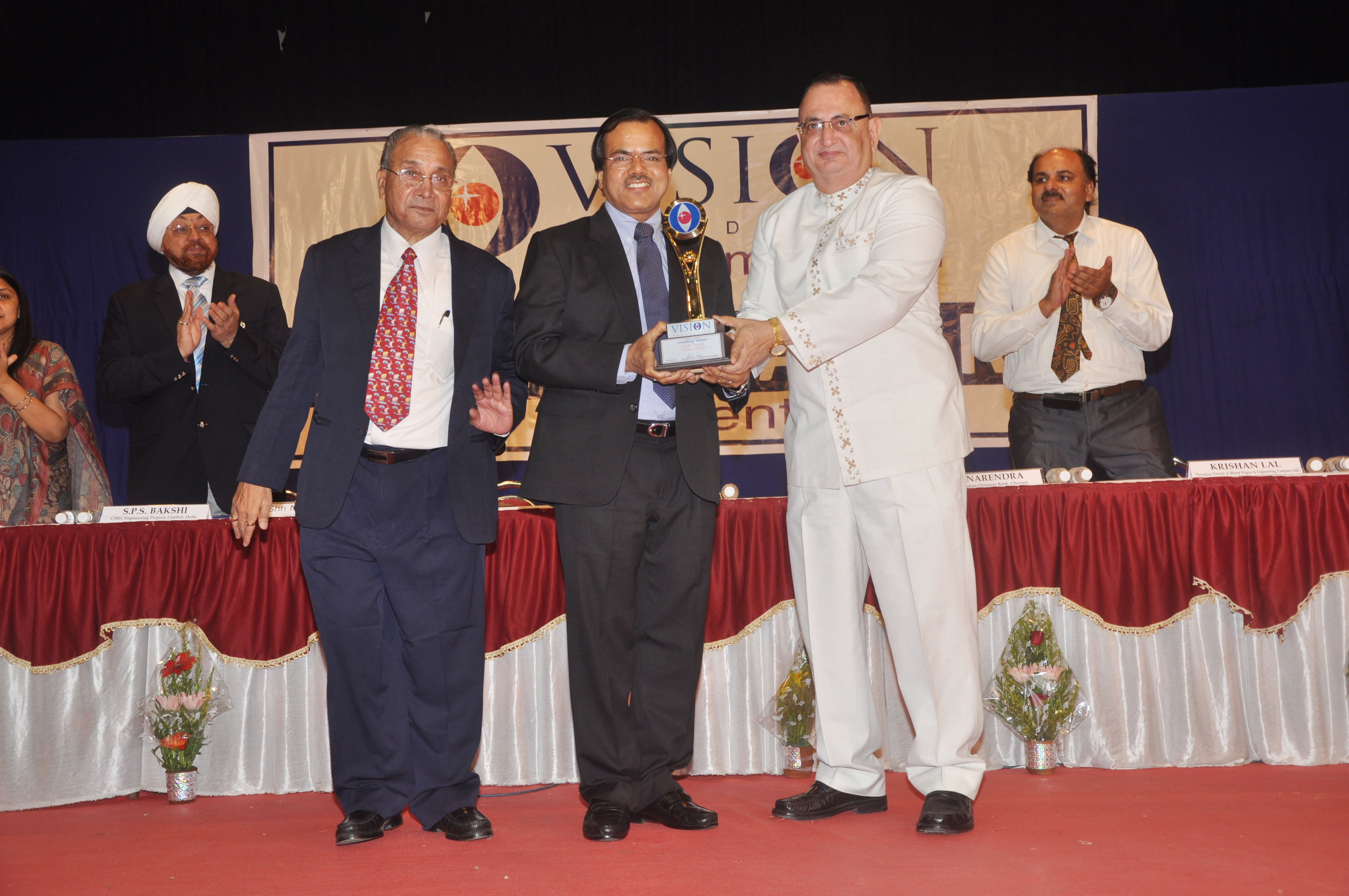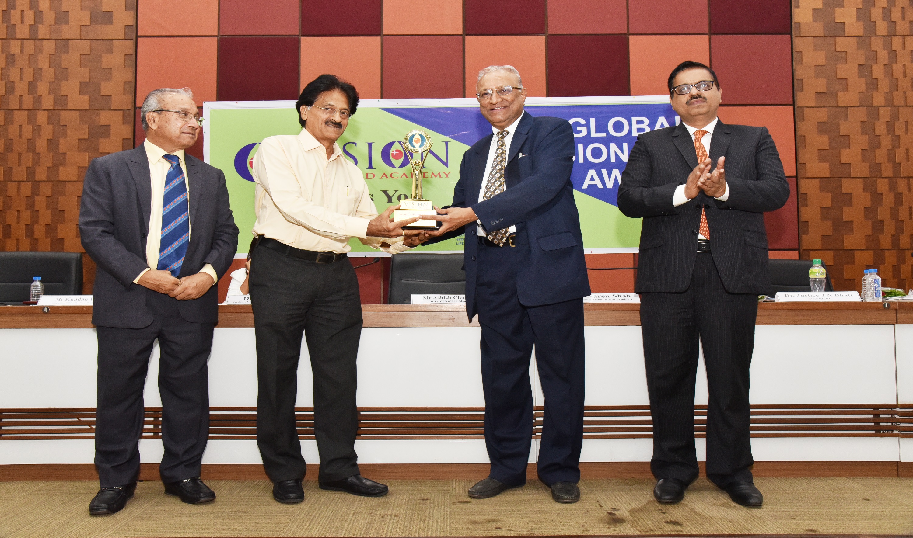 EX. Acting Chief Justice Gujarat B.J Sethna is presenting visionary Award to Shri M. Narendra CMD Indian Overseas Bank, Mr. Naren Shah Chairman of Vision world Academy on left.