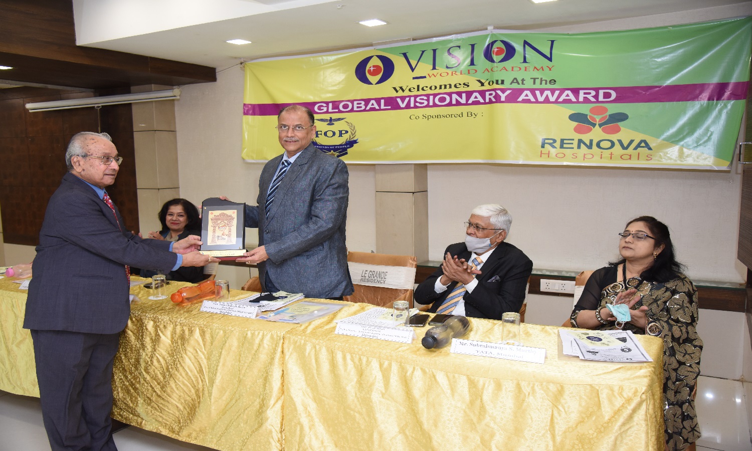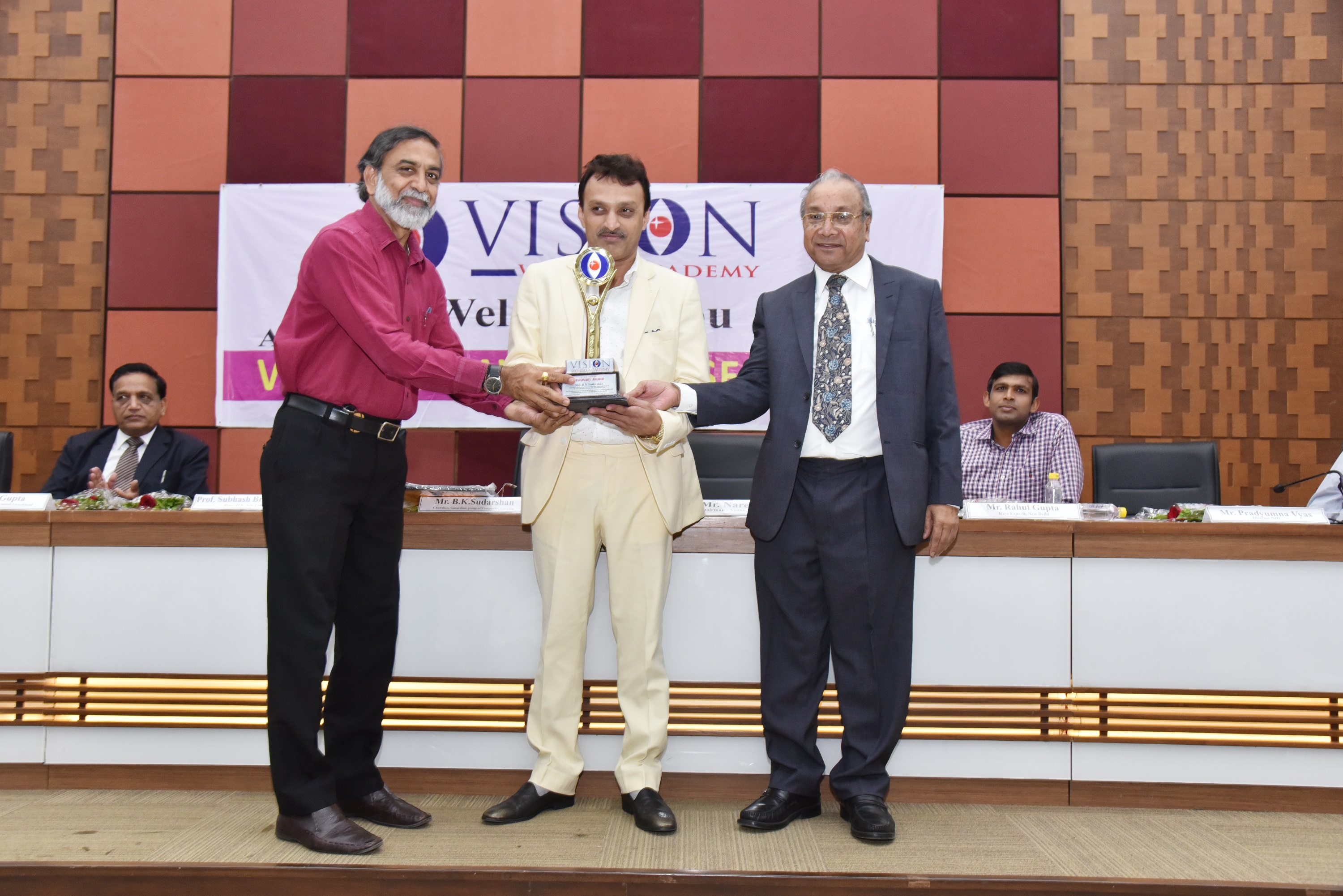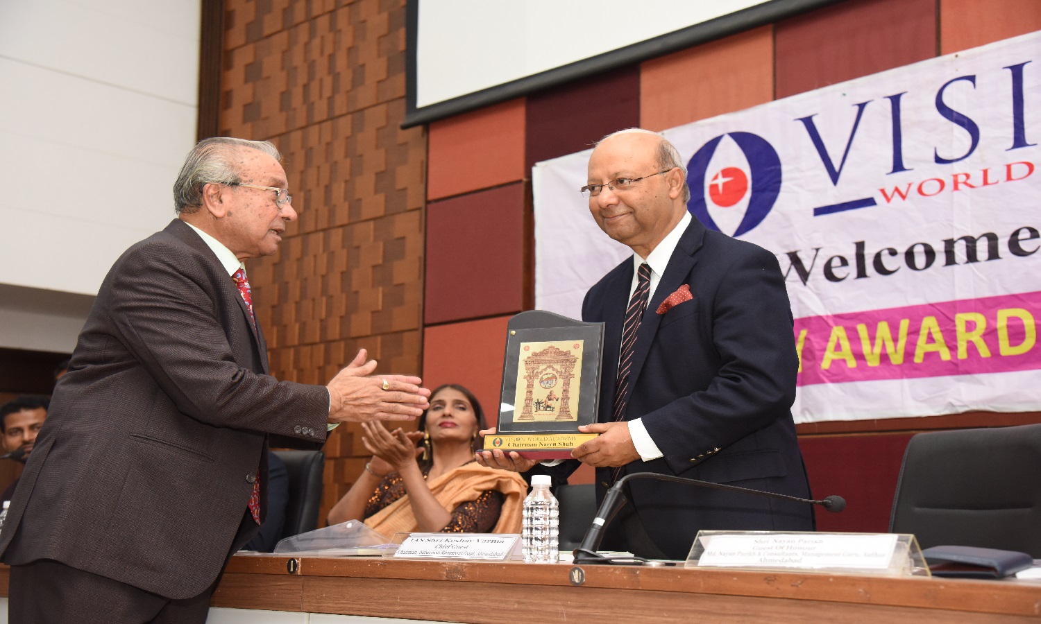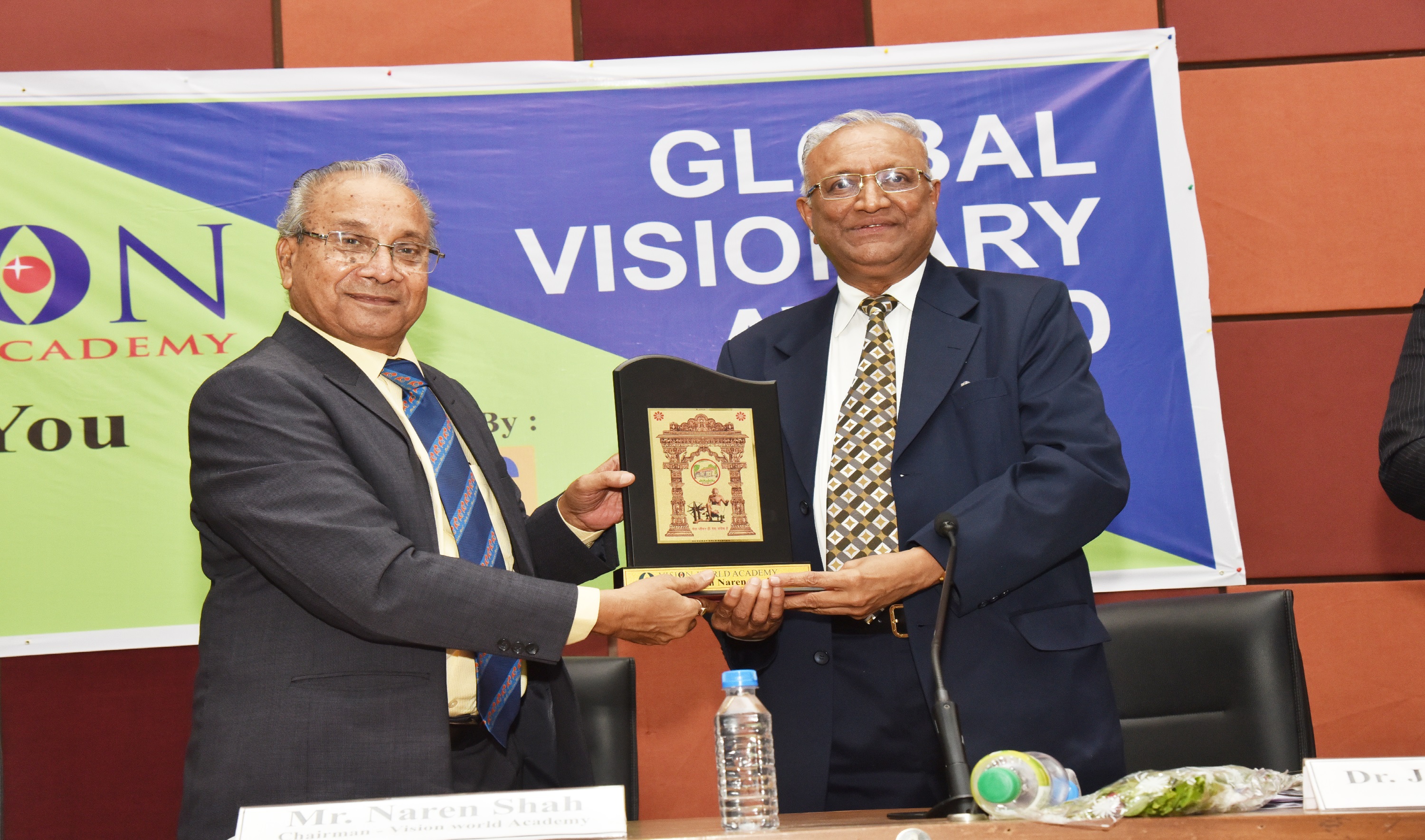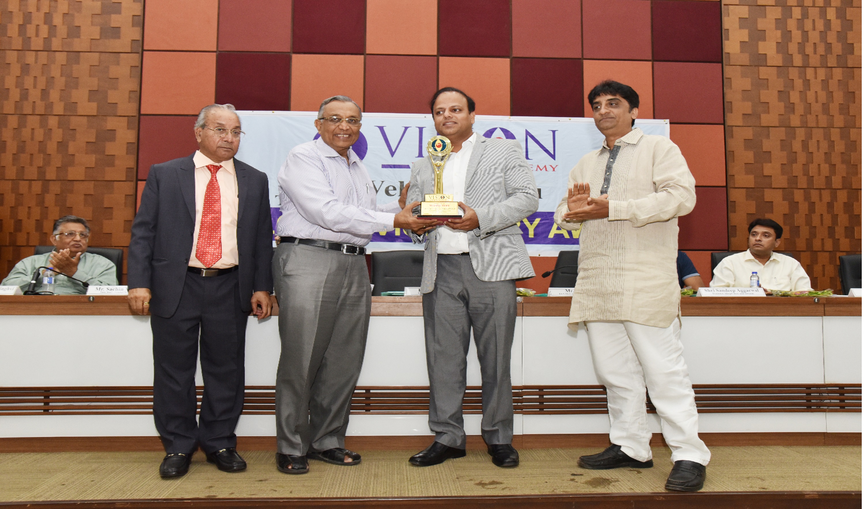 EX. Acting Chief Justice Gujarat B.J Sethna is presenting visionary Award to Shri M. Narendra CMD Indian Overseas Bank, Mr. Naren Shah Chairman of Vision world Academy on left.