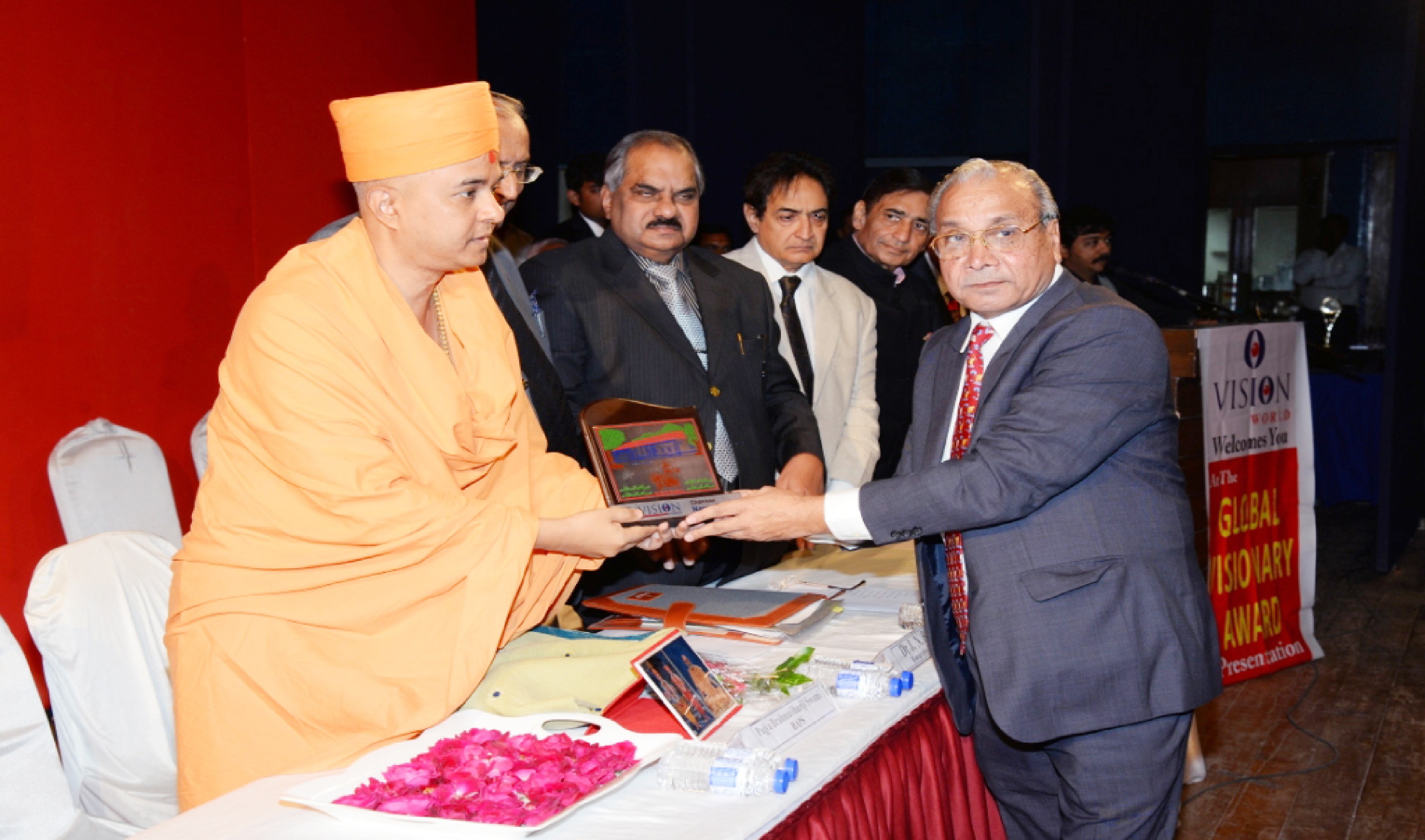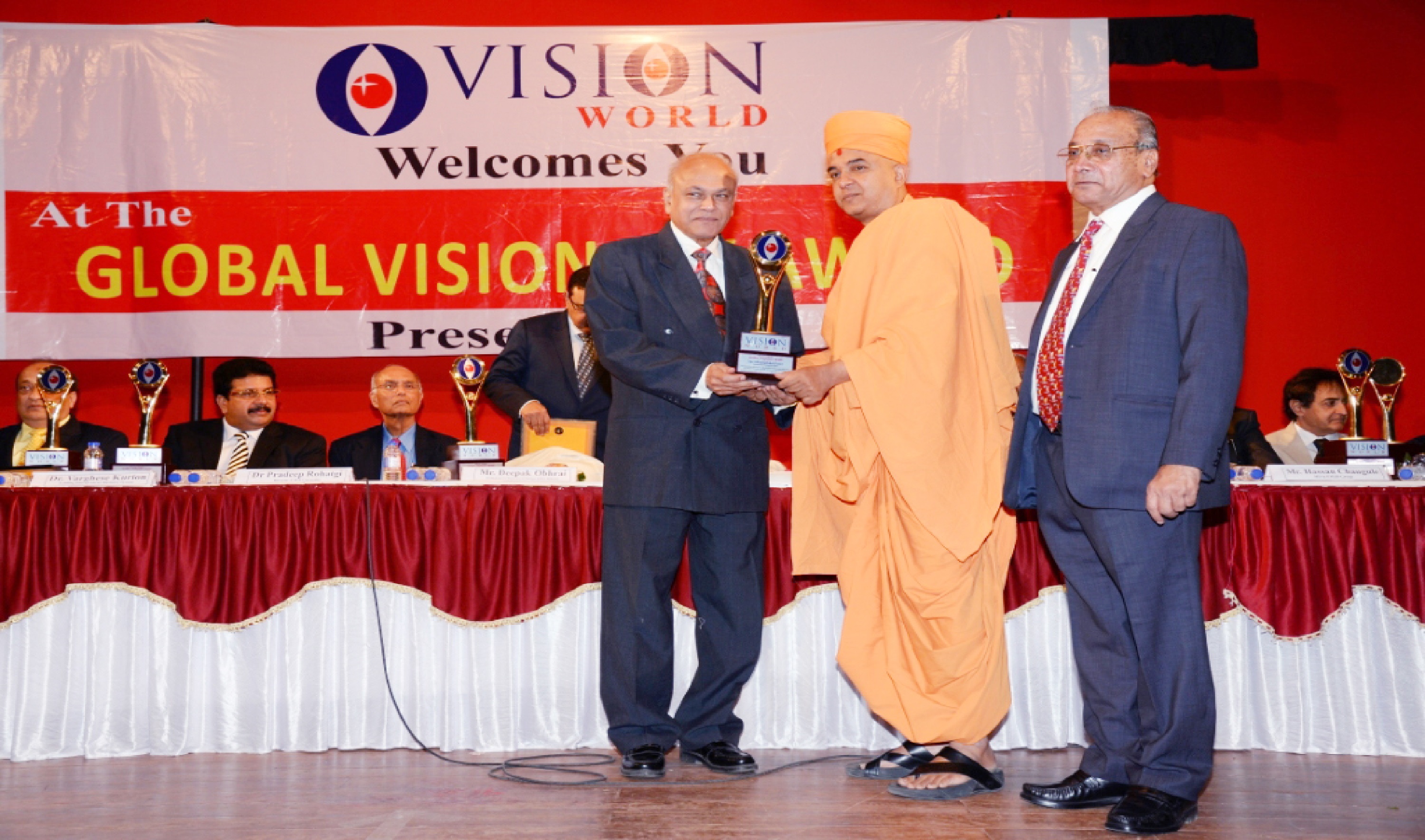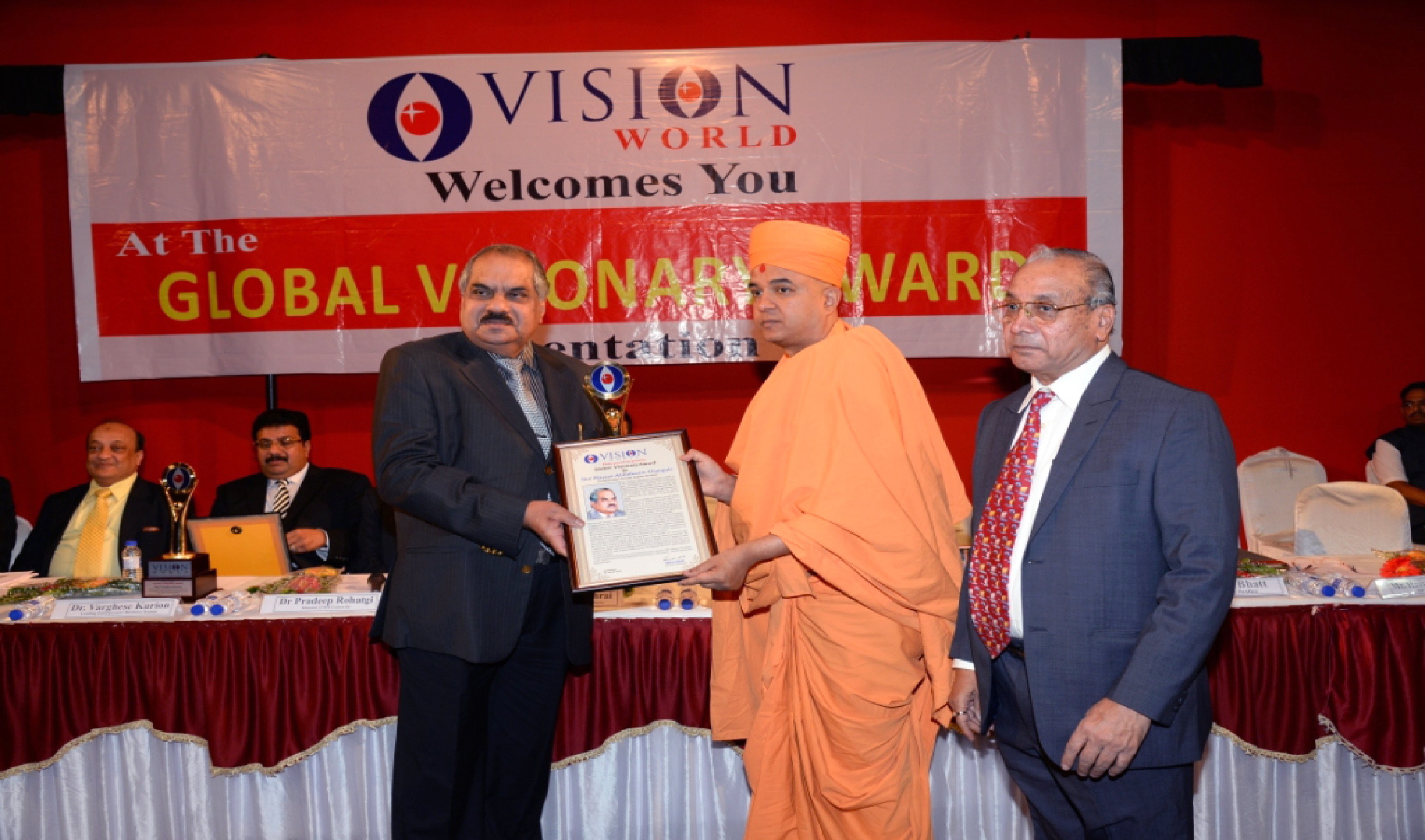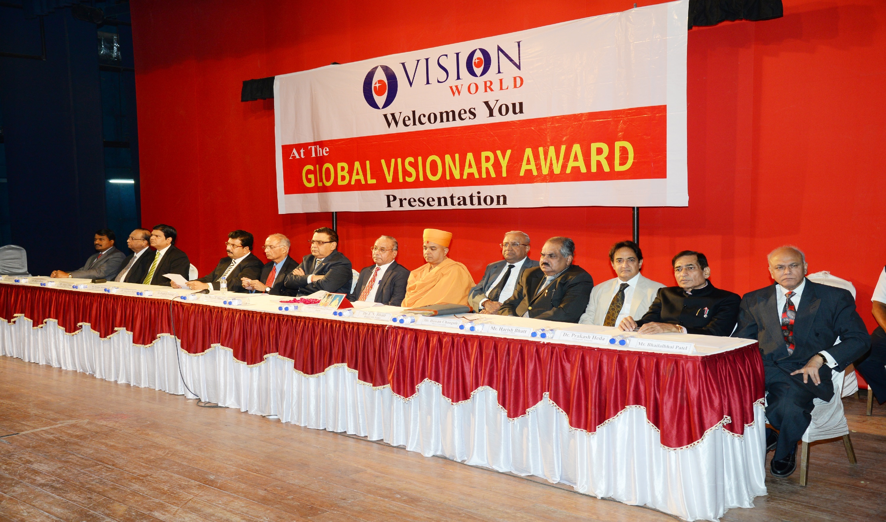 Mr. Bhailal Patel USA, Dr. Prakash Heda, Africa, Mr. Hasan Chouhule, Qatar, Dr. J.N Bhatt, Param Pujya Brahmavihari ji, Mr. Naren Shah, MR. Deepak Obhrai ,Canada, Mr. Pradeep Rohatgi USA, Dr. Varghese Kurian, Bahrain, Mr. Amol Titus, Indonesia, Mr. Bharat Barai, USA. Global Visionary Award Ceremony was Held by Vision world Academy on 10th January 2015 At Tagore Hall Ahmedabad.