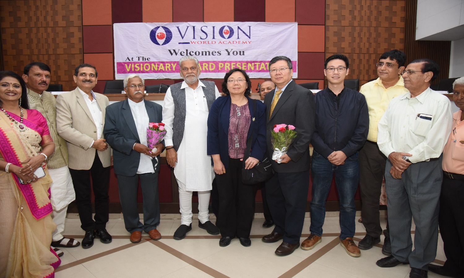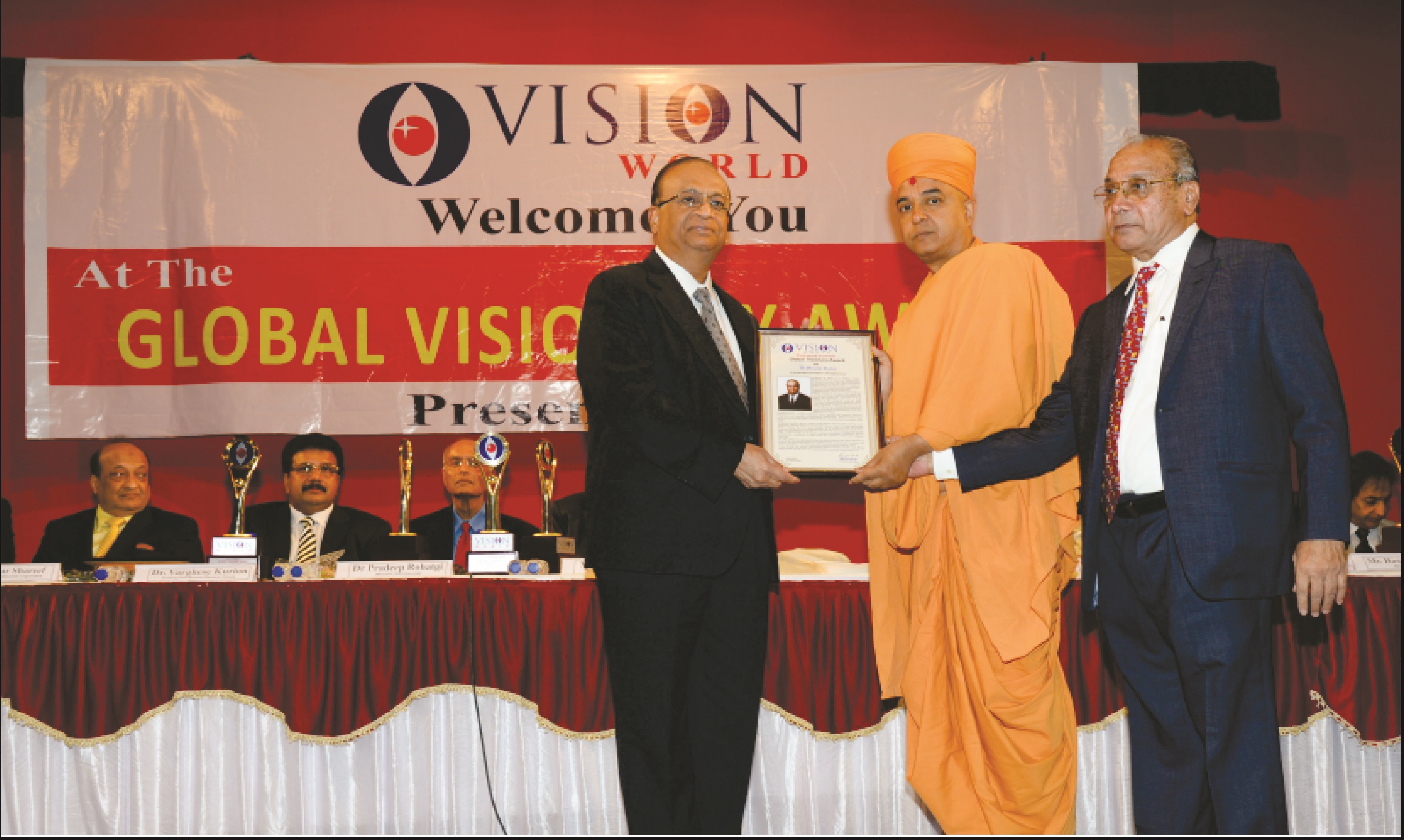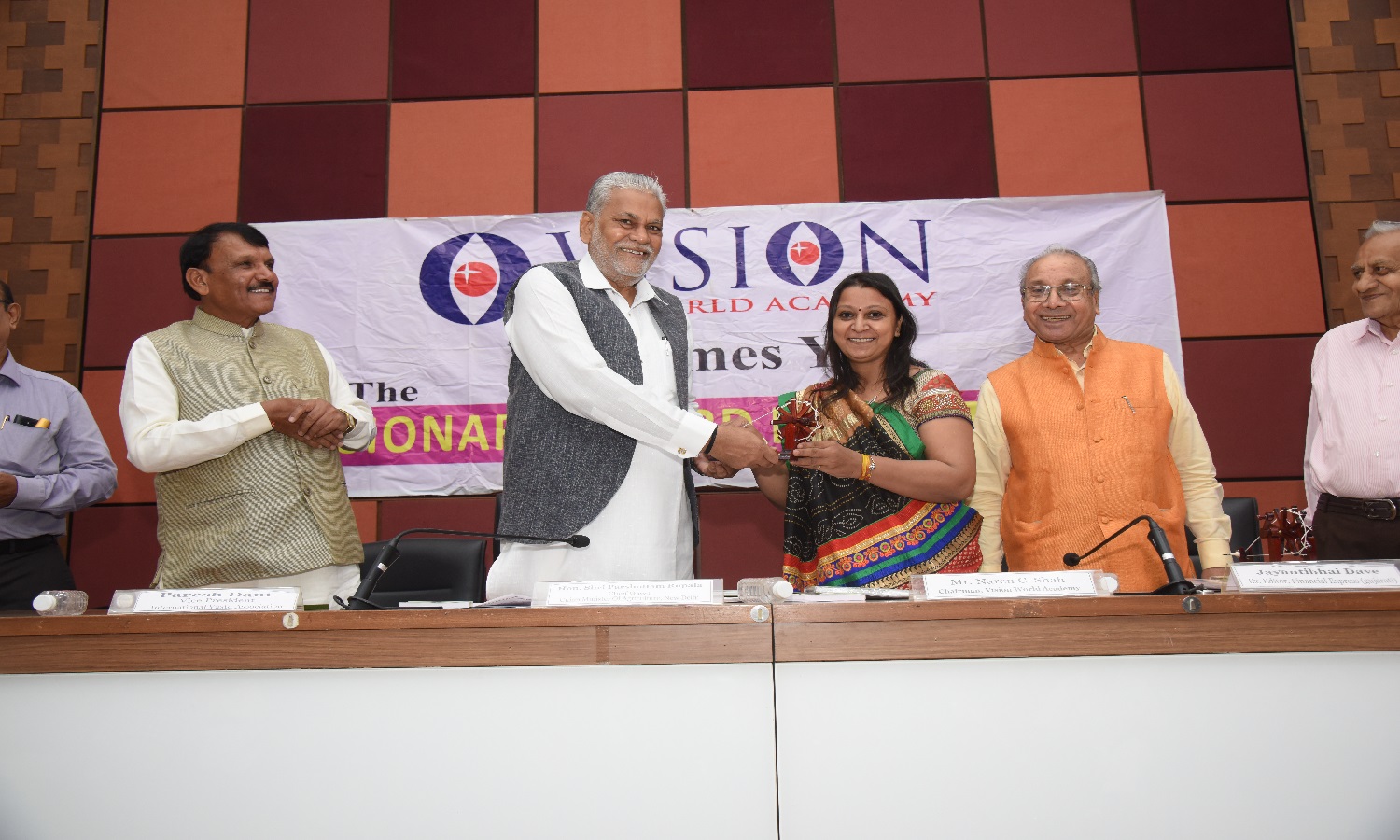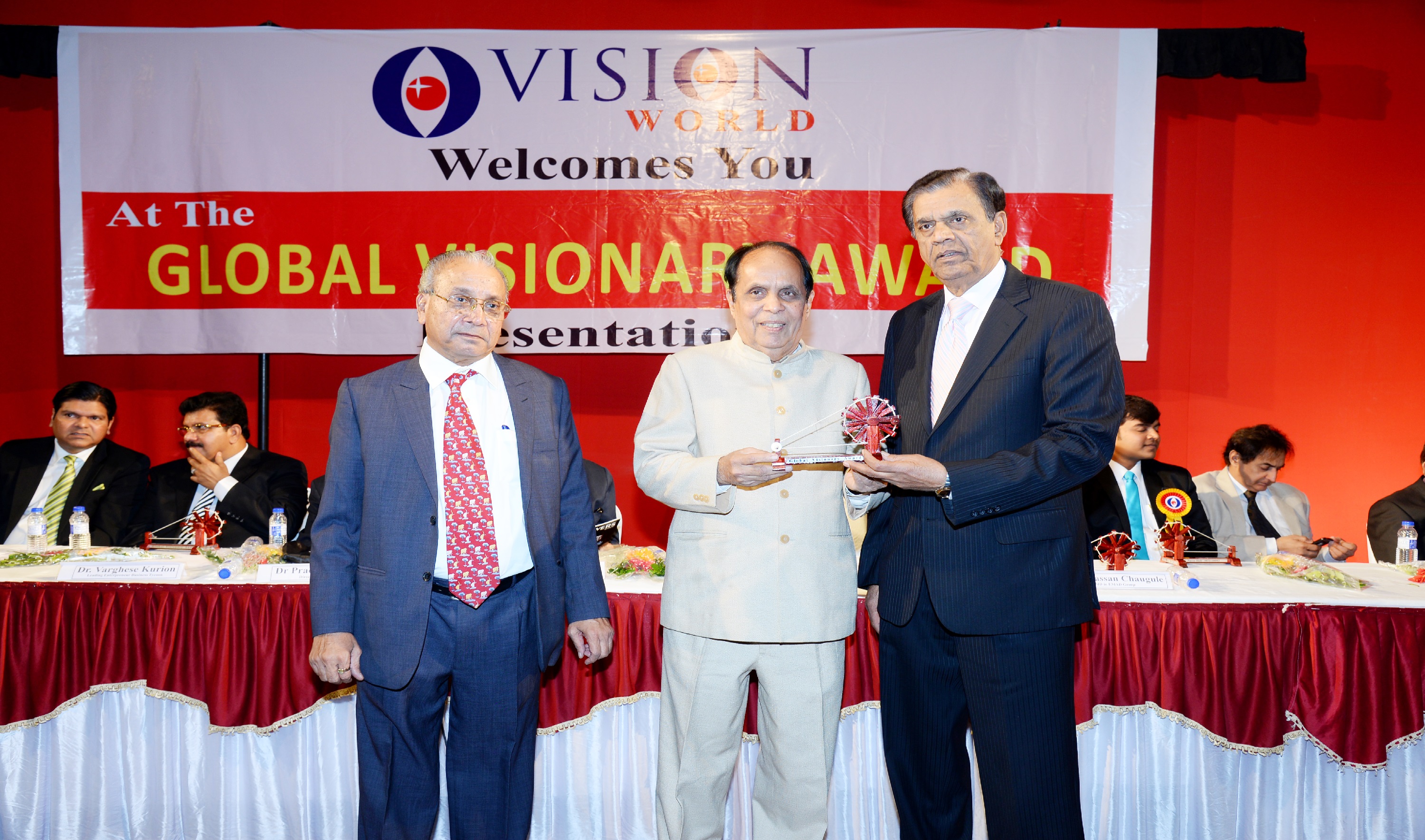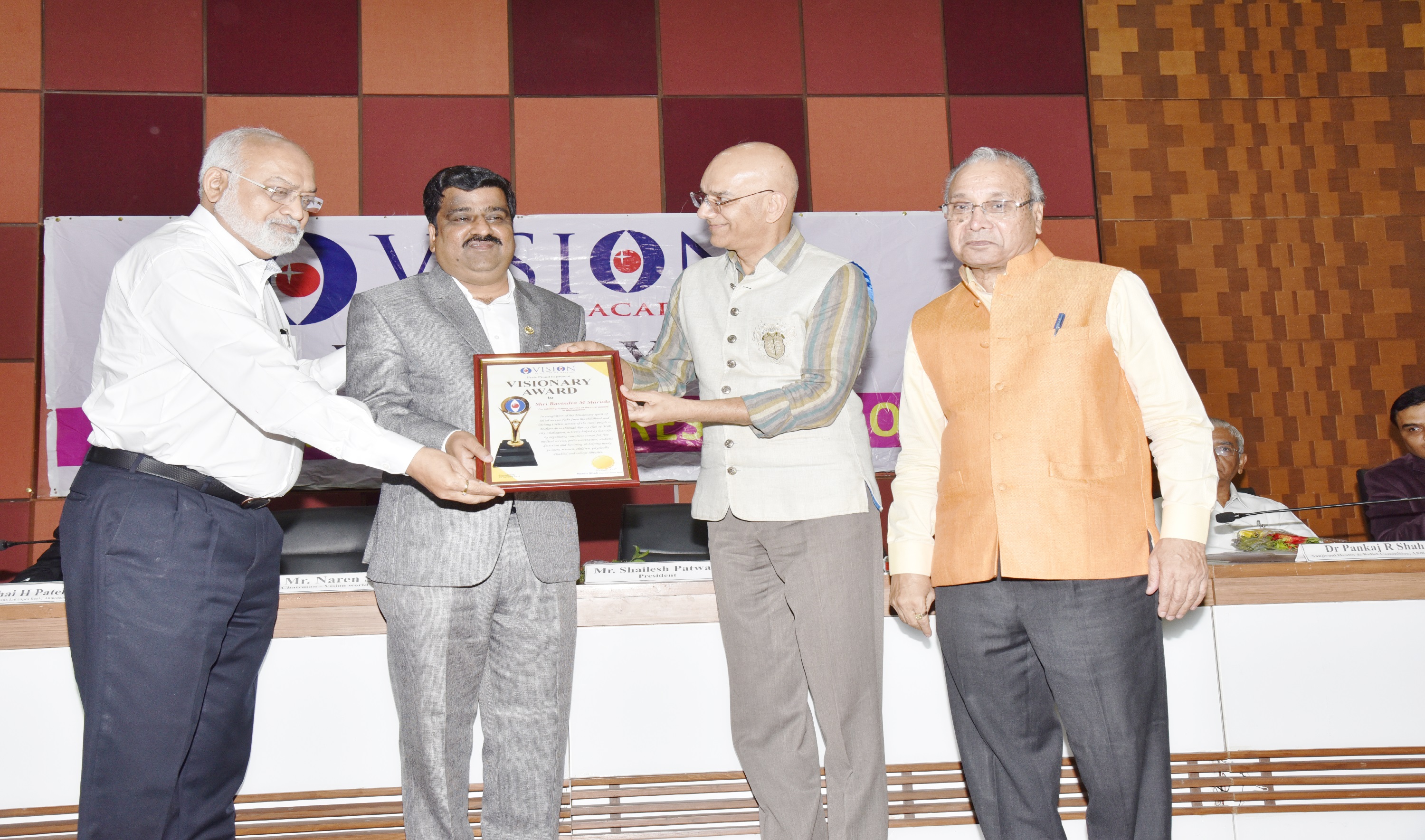 Mr. Bhailal Patel USA, Dr. Prakash Heda, Africa, Mr. Hasan Chouhule, Qatar, Dr. J.N Bhatt, Param Pujya Brahmavihari ji, Mr. Naren Shah, MR. Deepak Obhrai ,Canada, Mr. Pradeep Rohatgi USA, Dr. Varghese Kurian, Bahrain, Mr. Amol Titus, Indonesia, Mr. Bharat Barai, USA. Global Visionary Award Ceremony was Held by Vision world Academy on 10th January 2015 At Tagore Hall Ahmedabad.