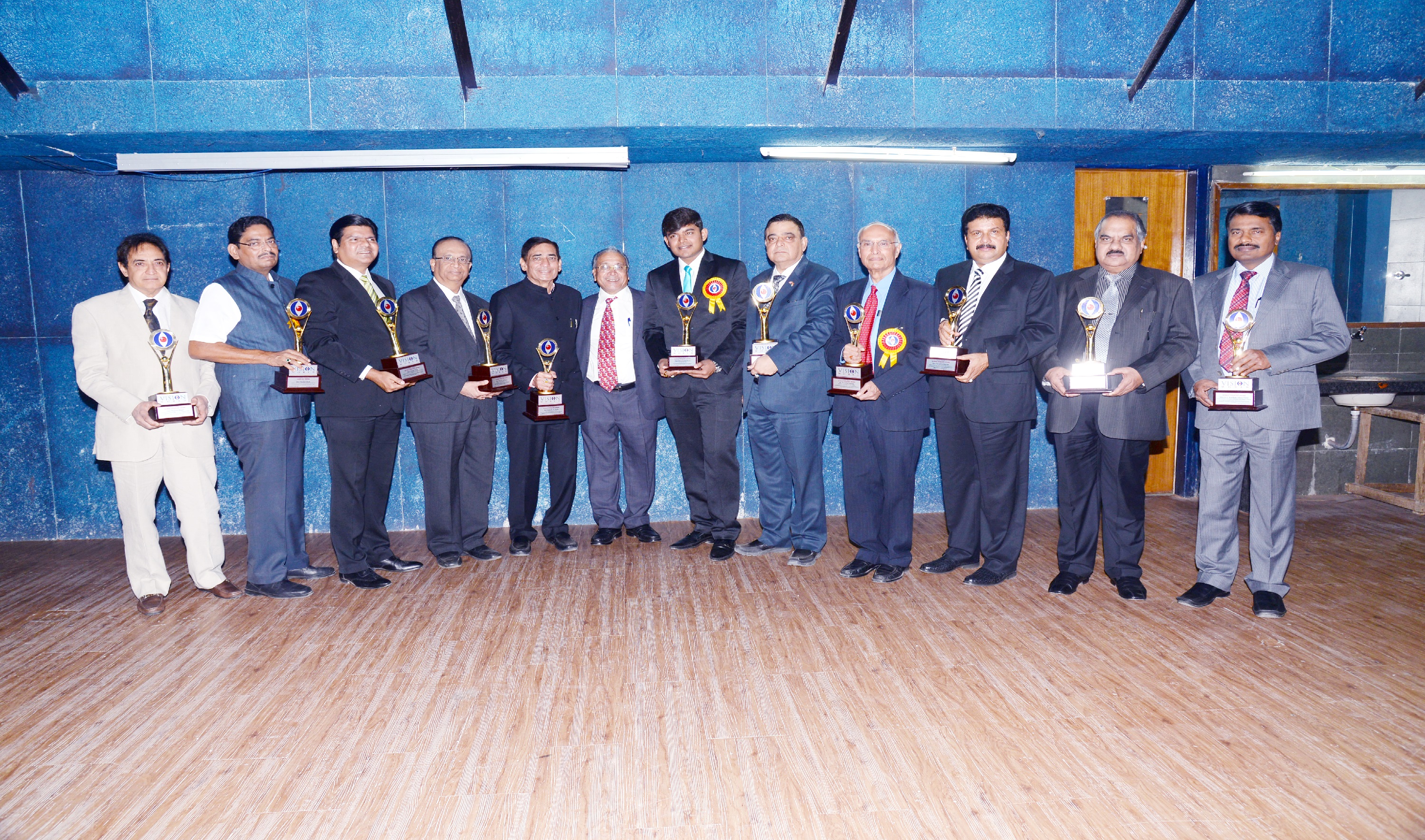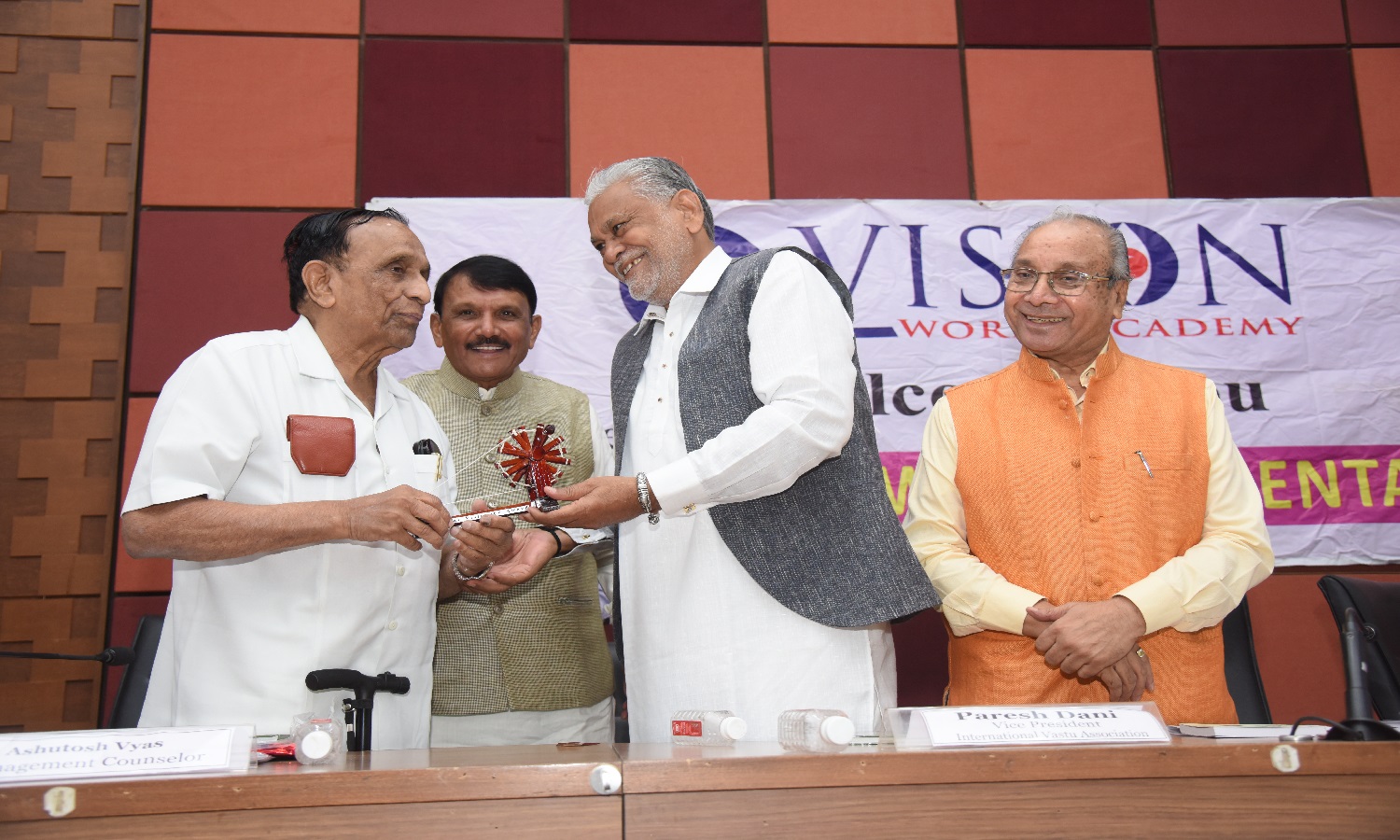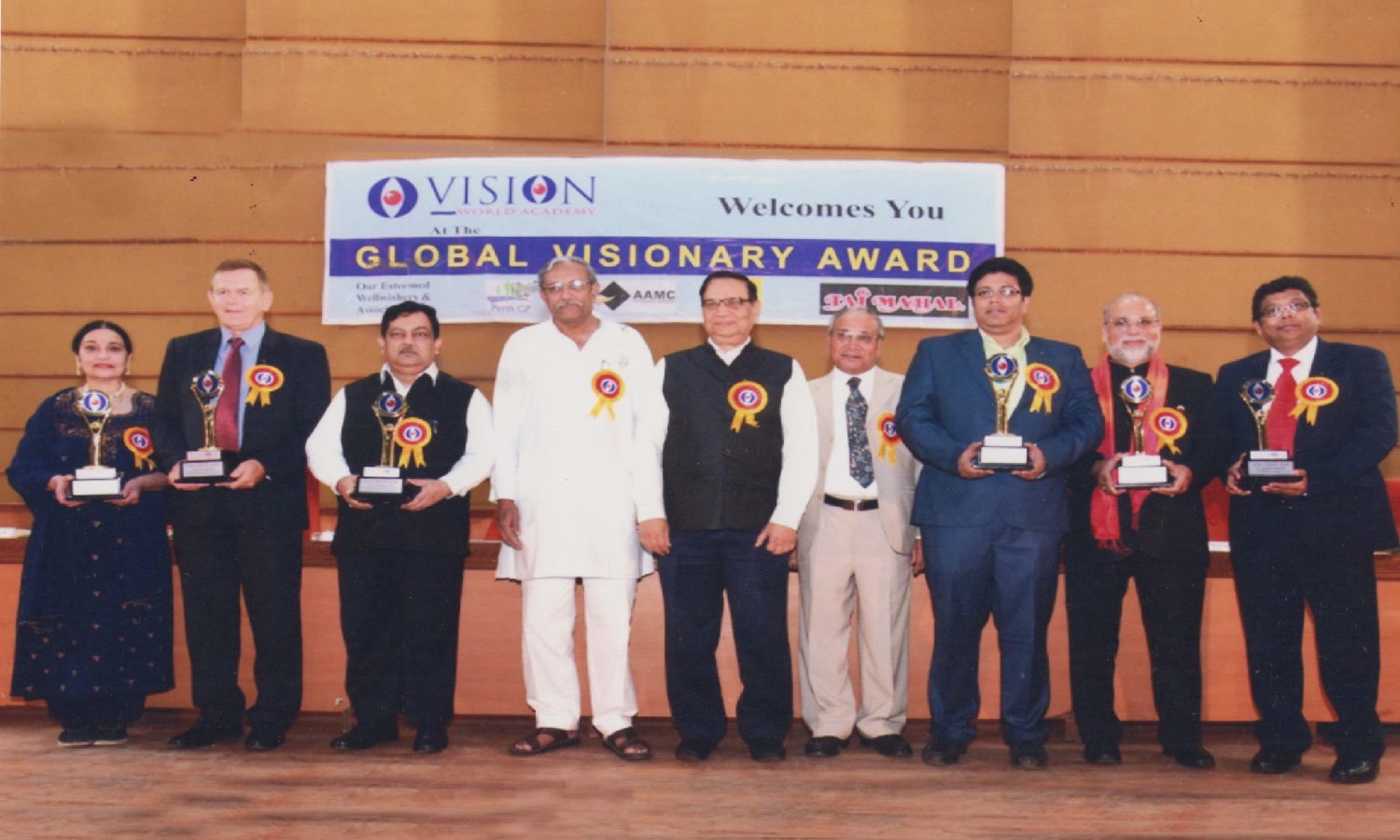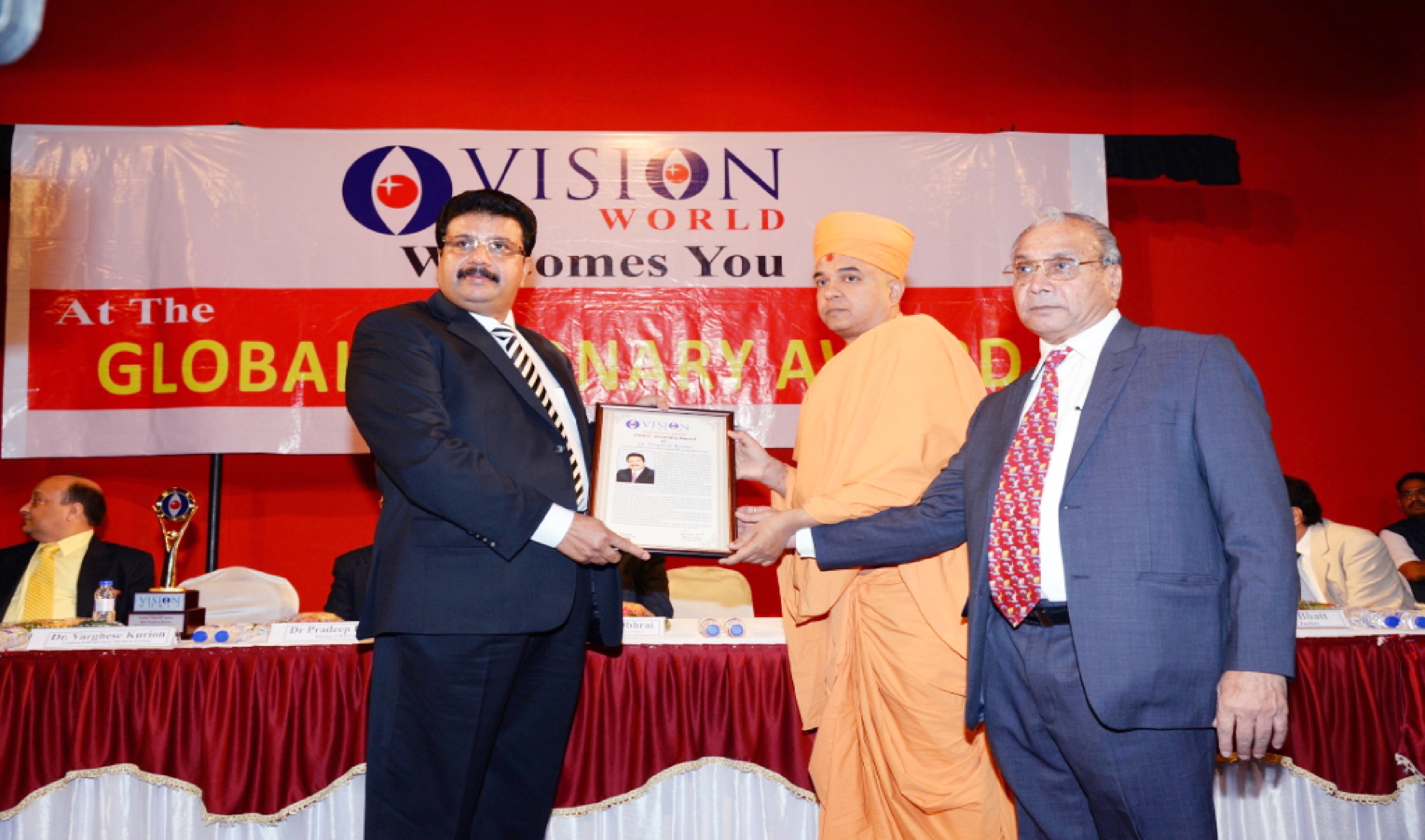 Mr. Bhailal Patel USA, Dr. Prakash Heda, Africa, Mr. Hasan Chouhule, Qatar, Dr. J.N Bhatt, Param Pujya Brahmavihari ji, Mr. Naren Shah, MR. Deepak Obhrai ,Canada, Mr. Pradeep Rohatgi USA, Dr. Varghese Kurian, Bahrain, Mr. Amol Titus, Indonesia, Mr. Bharat Barai, USA. Global Visionary Award Ceremony was Held by Vision world Academy on 10th January 2015 At Tagore Hall Ahmedabad.