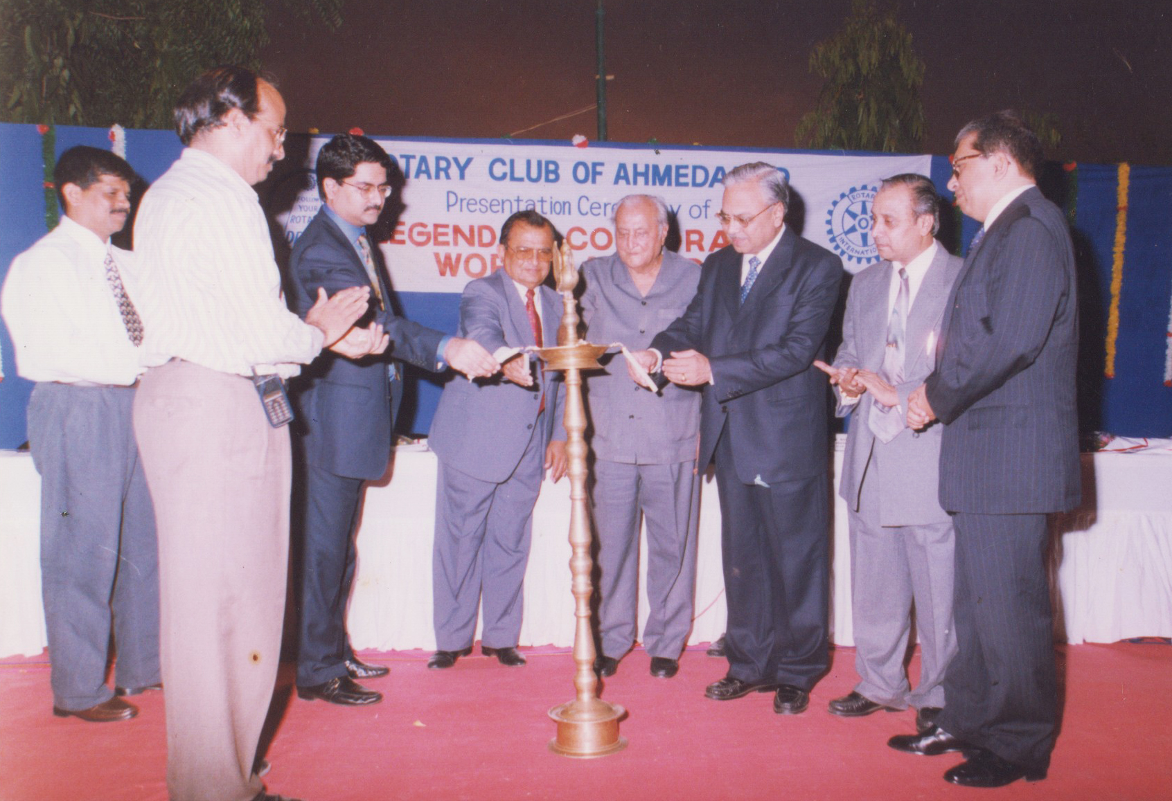 On the occasion of Rotary Award legend of corporate world lighting of the lamp was done by from left:- Shri Kumar Mangalam Birla (chairman, Aditya Birla Group) Shri Ashwin Nagarwadia (Ex. Chairman, Ingersoll rand), Late. Shri Arvind Narottam Lalbhai, Late. Shri. P S Subramanyam (Ex. Chairman UTI), Naren Shah (Ex. President Rotary Club & Shri R. Basu (Asia Chief Star TV)