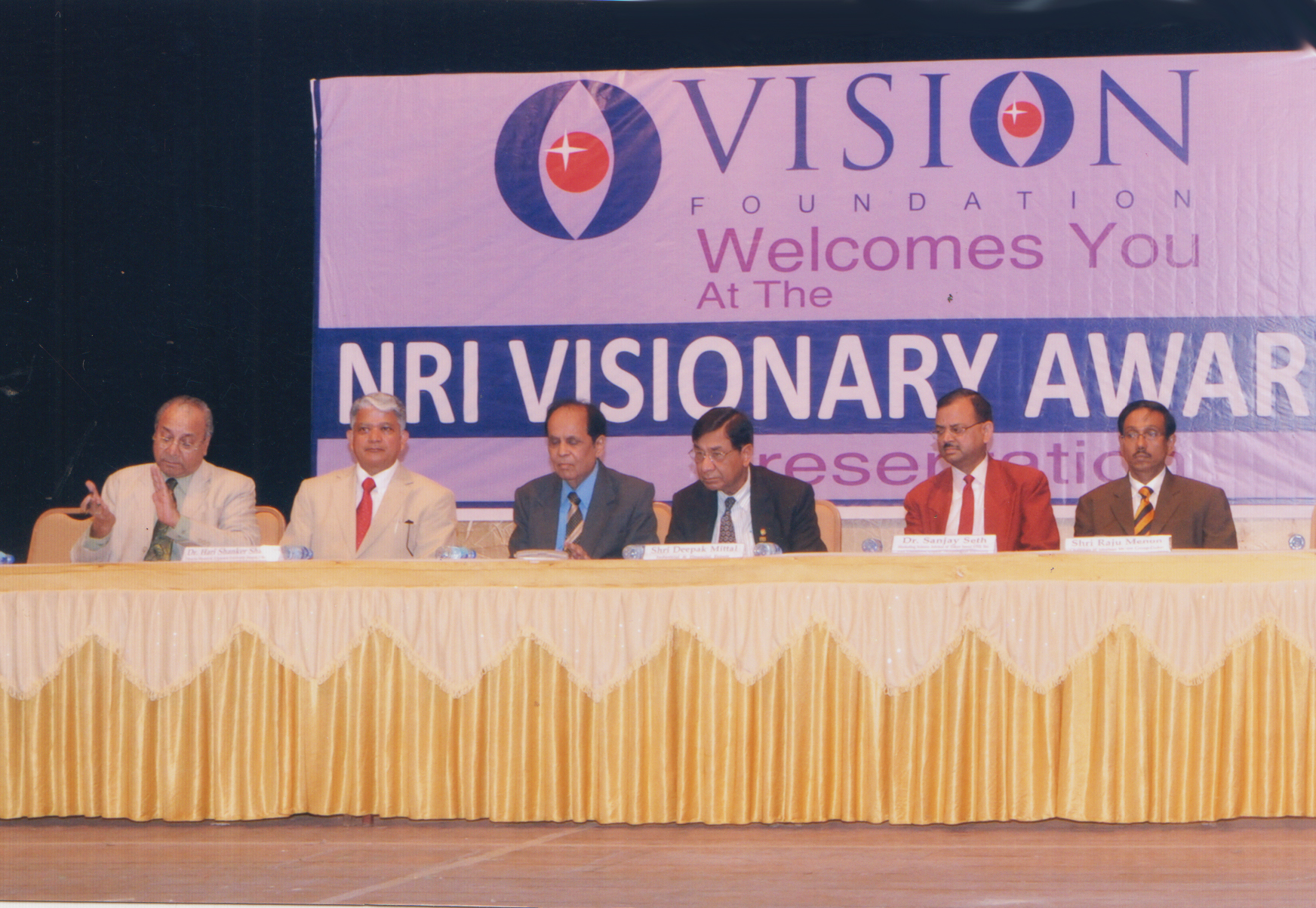 NRI Visionary Award function was held at Ahmedabad on 23rd Nov, Friday at Tagore Hall Paldi, Dignitaries on the Dias from left Naren Shah - Chairman of Vision world Academy Dr. Hari Shankar Sharma, Sweden, Shri Madhukar Dhruv - President of NRI Visionary Award, Shri Dipak Mittal-Director, Thai Carbon Black Co.Ltd. Thailand, Dr. Sanjay Seth, Marketing Science Advis-Japan & SHri Raju Menon, C.A Chairman. Morison Menon Group, Dubai.