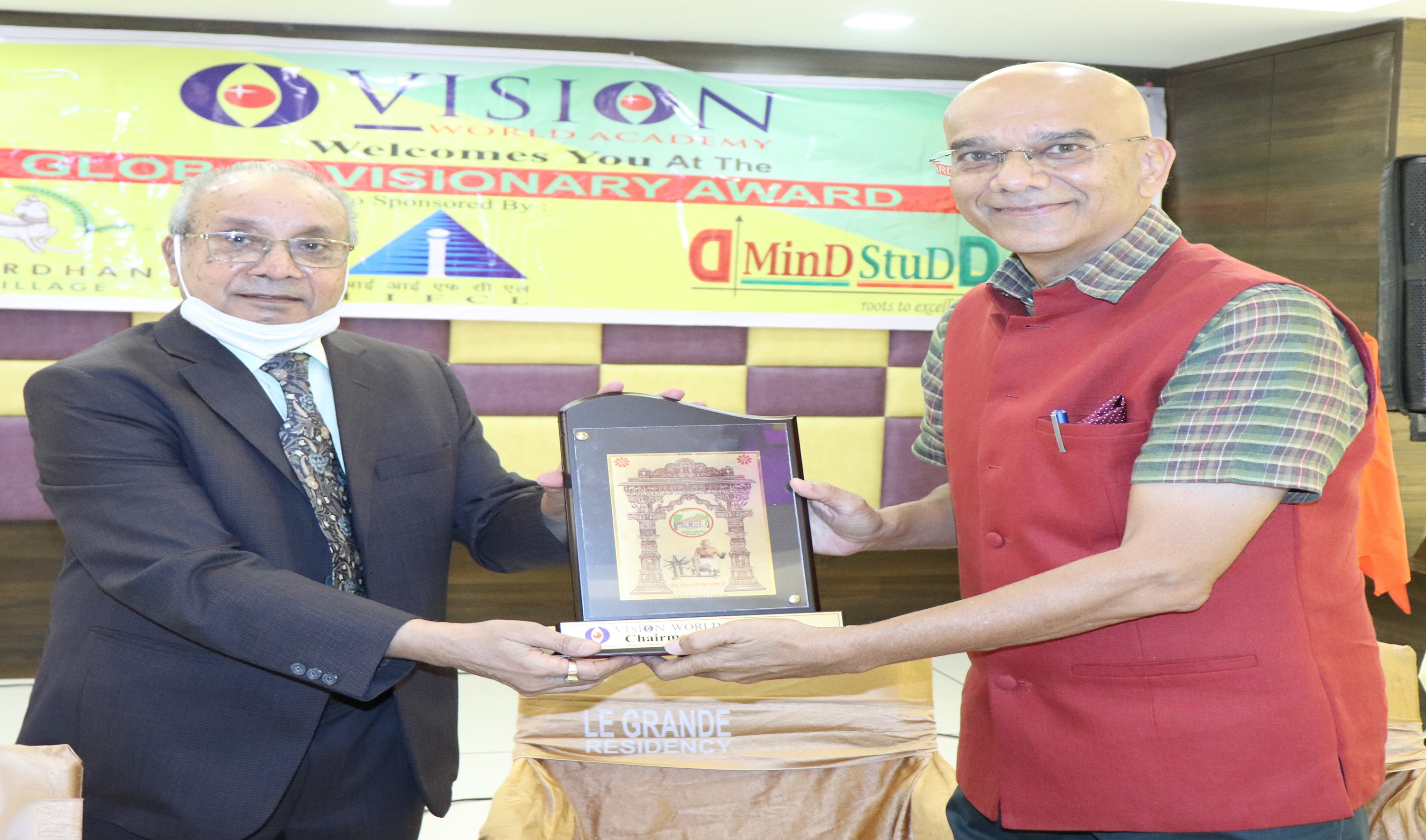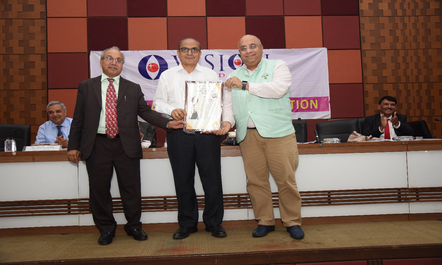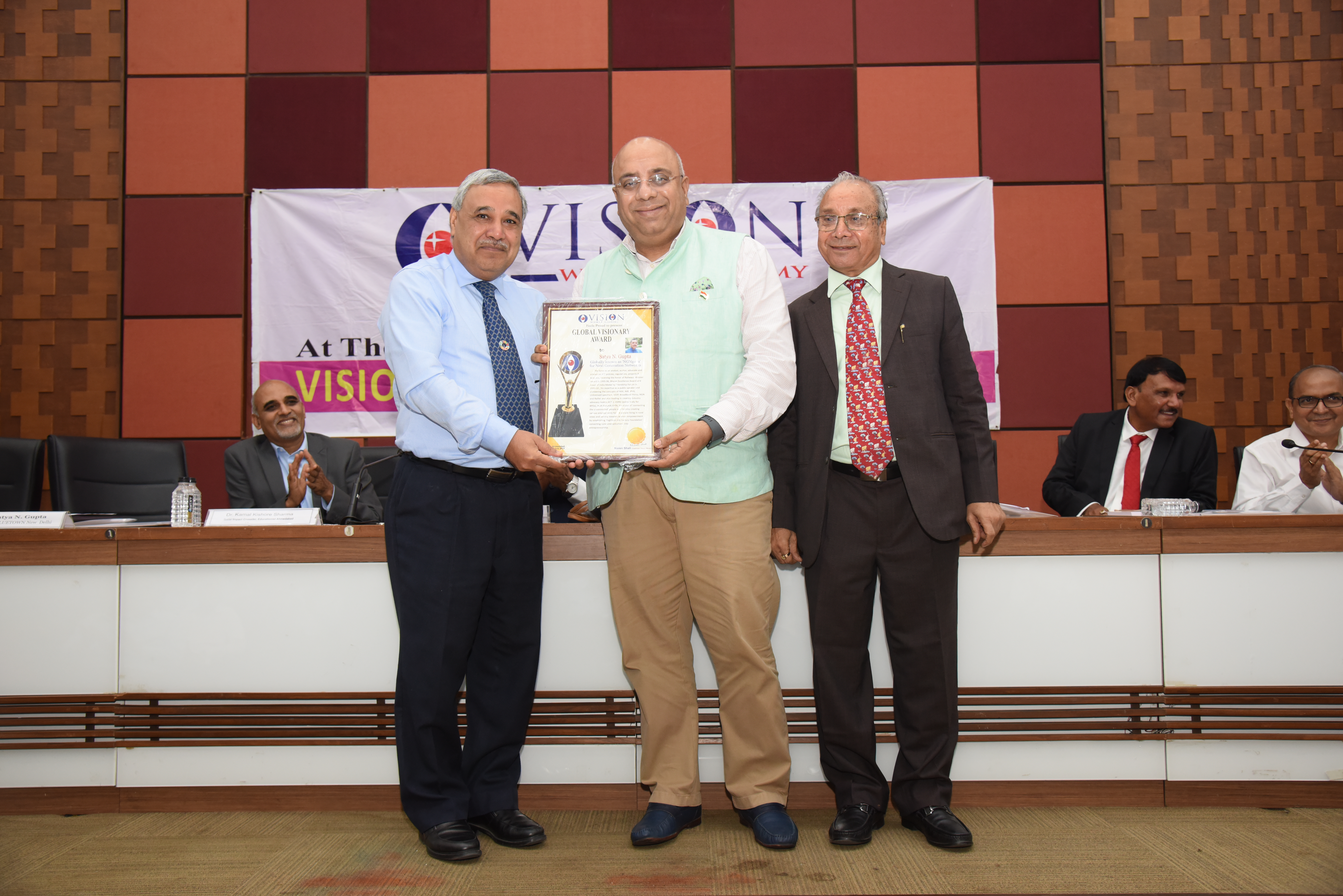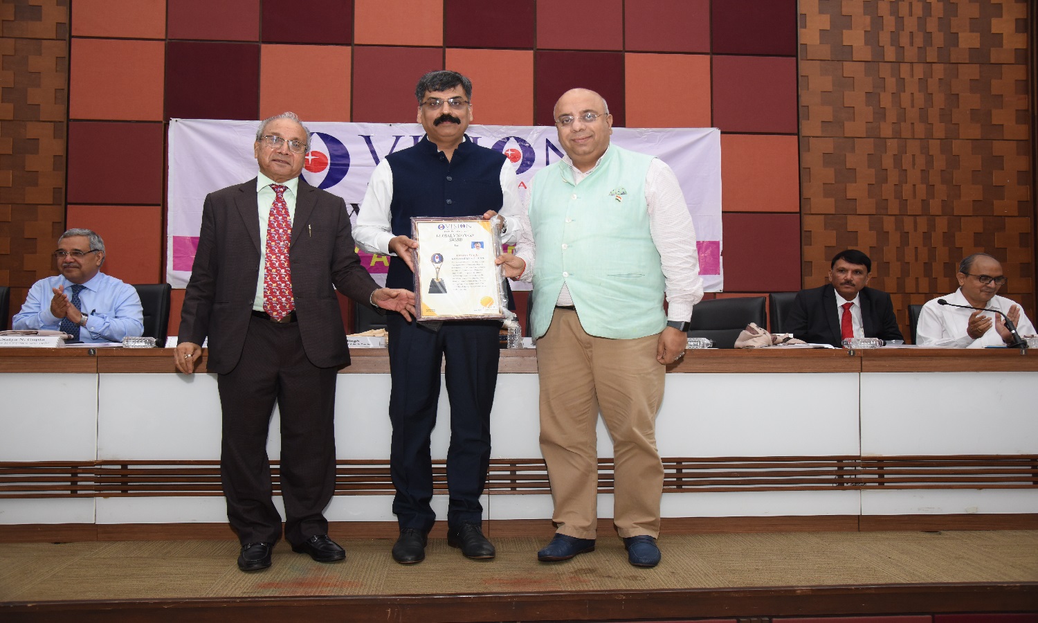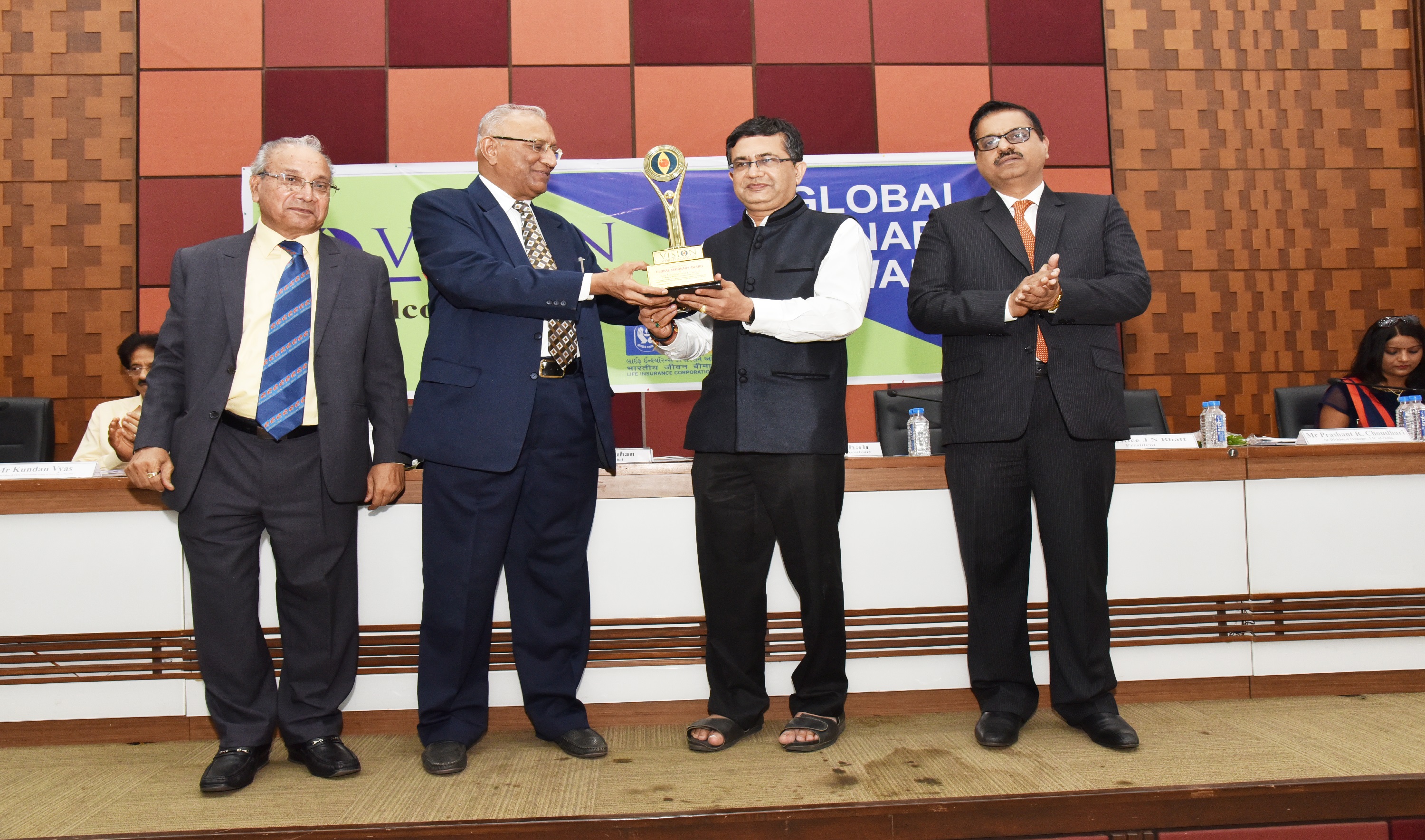 LIC Hosing Ex. MD Mr. Rai was Honoured with Global Visionary Award by Dr. Vyas Ex. Director NID, Mr. Naren Shah is in the picture.