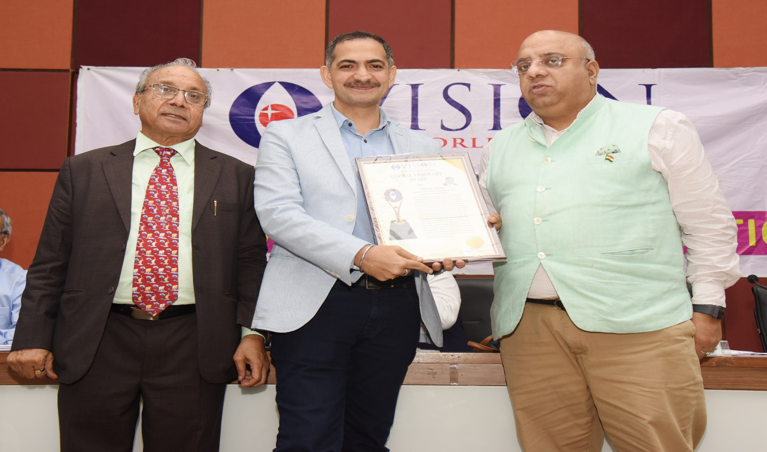 Mr. Vikram Mehta, CEO & MD, Custom Technologies, Mumbai. was honored by Shri Anurag Batra, Chairman, Business World Group, New Delhi. & Mr. Naren Shah, Chairman, Vision world Academy. 29th July 2019.