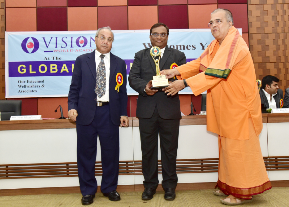 Dr. Krishnamachary Mudumba, GM, Bank Of Baroda, Africa. Was honored by Honourable Union Minister Shri Parshottam Rupala, Shri Naren Shah, Chairman, Vision world Academy. 22th October 2019.