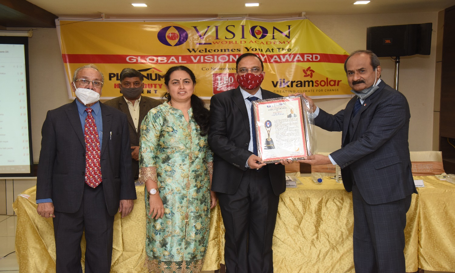 Global Visionary Award Ceremony was held 24th February 2021. Hon. Ex.Chief Justice Kalpesh Jhaveri, C.A Sunil Talati, Mrs. Subrahmanya, Shri Prashant Kinarivala, Ms. Bharti Chauhan, & Mr. Naren Shah were on the Dias. 24th February 2021.