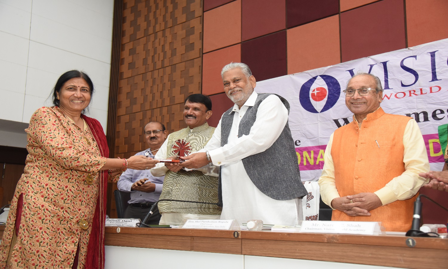 Mr. Amit Gupta, MD, Sterna India, A Tahal Group Company, Delhi. was honored by Honourable Union Minister Shri Parshottam Rupala, Shri Naren Shah, Chairman, Vision world Academy. 22th October 2019.