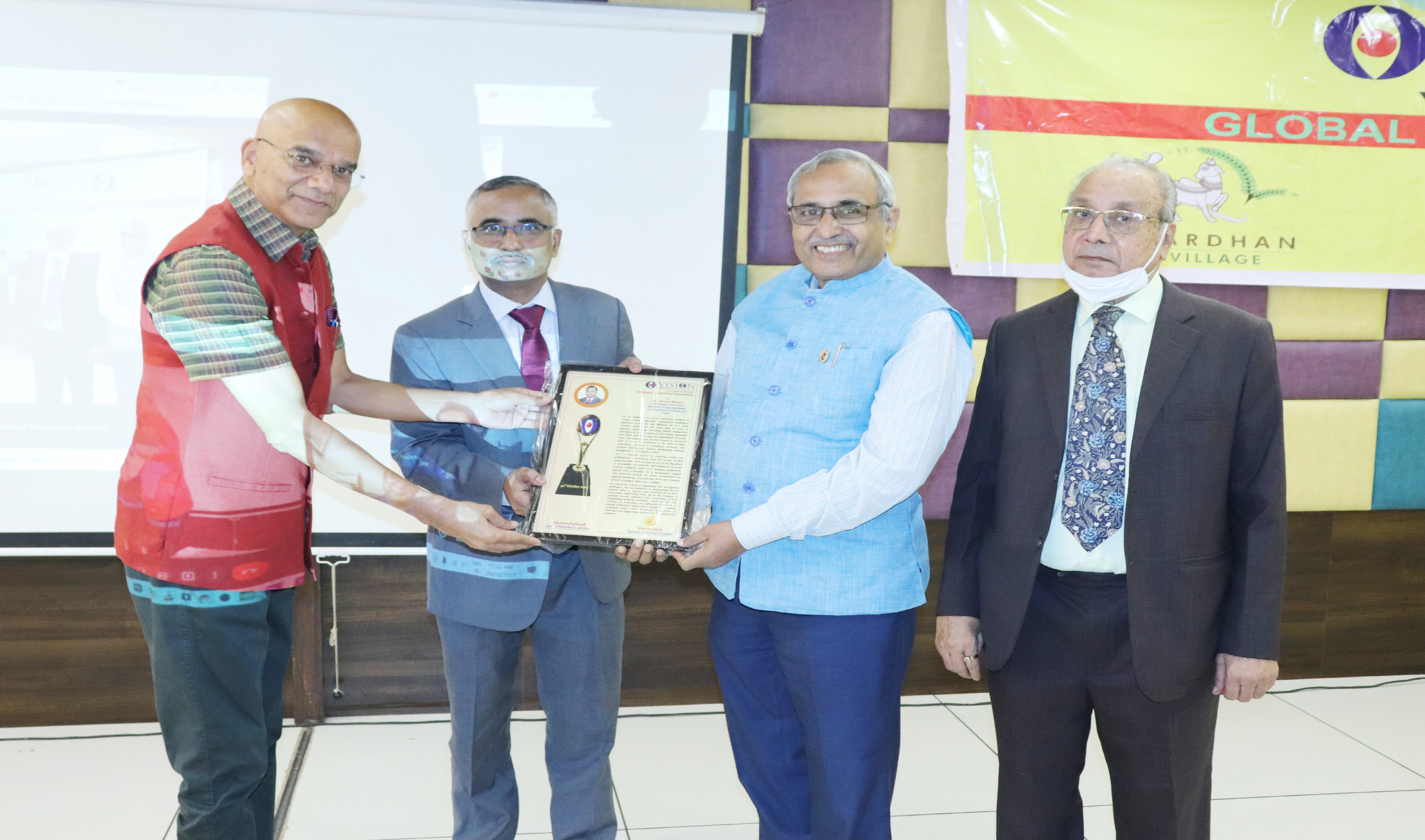 Dr. Maruti Khaire, Technologist, Innovator, Pune. was honored by Prof. Dr. Navin Sheth, Vice Chancellor, Gujarat Technological University, Ahmedabad. & Guest Of Honour Shri Nayan Parikh, MD, Nayan Parikh & Consultants, Ahmedabad. & Shri Naren Shah, Chairman, Vision world Academy. On 30th October 2021.